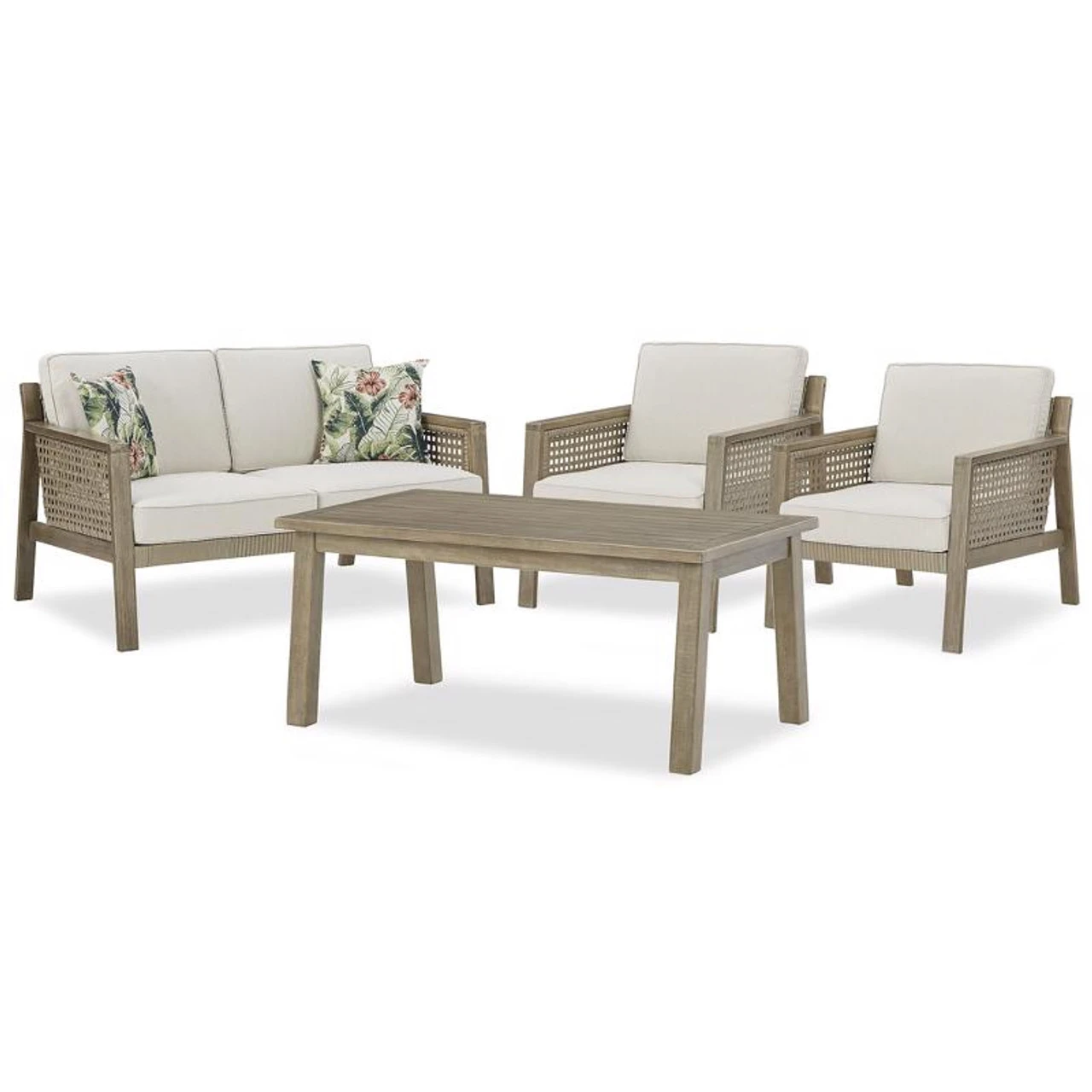 You’ve got it made in the shade with this outdoor set. Made of eucalyptus wood, this set has a rustic charm and is built to last. Tan cushions are wrapped in easy-clean Nuvella fabric, which stands up to harsh weather for season after season of enjoyment. Featuring one loveseat, two lounge chairs, and a coffee table