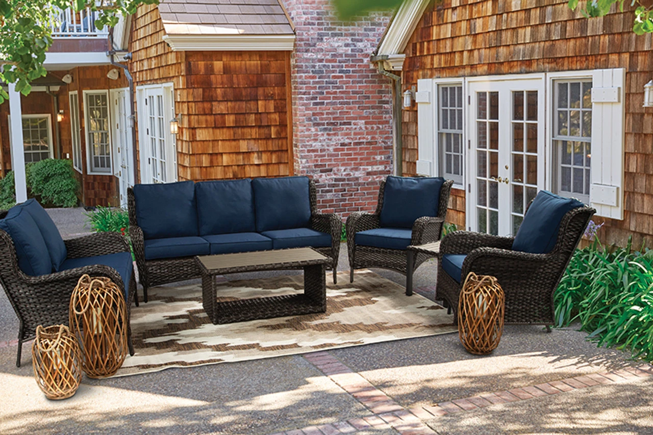 The perfect marriage of style and substance, our Avoverlndale collection features deep brown seagrass wicker overlaying steel frames. The stationary chair, glider chair, loveseat and sofa are complemented with a dash of deep color from the navy olefin cushions. The coffee and side table are topped with faux wood slats.