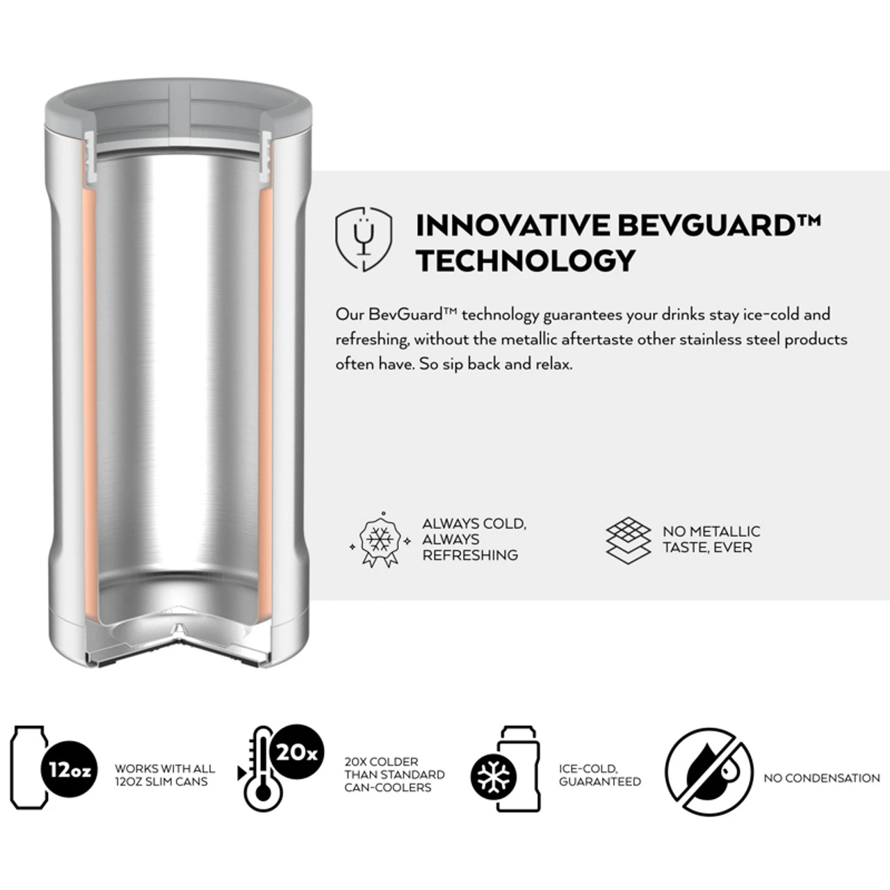 The BruMate Hopsulator Slim is the world’s first triple-insulated, stainless steel can-cooler designed exclusively for 12oz slim cans. Our BevGuard ensures every drop is just as cold as the first with zero condensation while Push-Lock Technology makes inserting and removing your cans a breeze. Works with White Claw, Truly, Michelob Ultra, Corona Light, Red Bull and others. If you can’t stand the heat, don’t sweat it. The Hopsulator Slim keeps all of your favorite 12oz slim canned beverages icy-cold, no matter how hot the party gets. Our BevGuard technology guarantees your drinks stay ice-cold and refreshing, without the metallic aftertaste other stainless steel products often have. So sip back and relax.