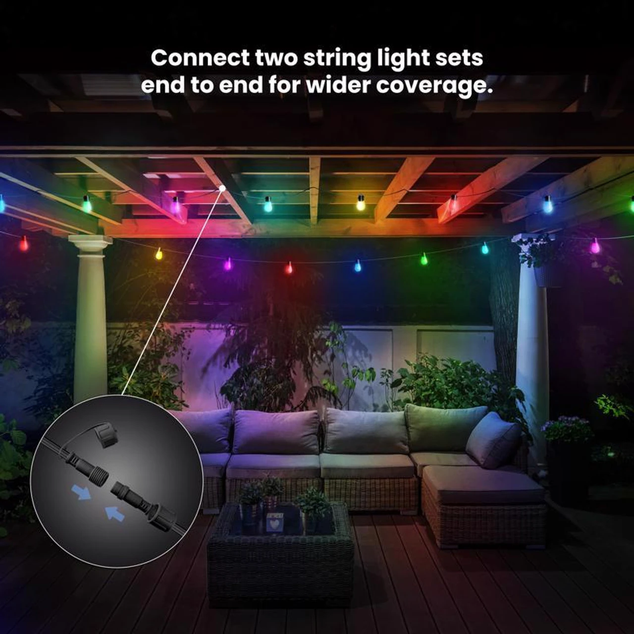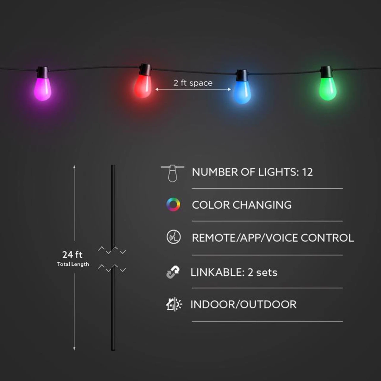 Enhance your outdoor decor with the enchanting glow of Color Changing Smart LED String Lights from Feit Electric. Enjoy the best of both worlds with a traditional string light look and smart technology. Perfect for lighting gazebos, patios, restaurants, and more, these lights work with or without Wi-Fi. Use the included RF remote control to change colors and brightness or select preset modes, even through walls. Or, connect to Wi-Fi and control using the Feit Electric app. No subscription fees or hubs needed. Easily turn lights on/off, adjust colors, dim, and set groups and schedules from anywhere. Choose an inviting white glow or get creative with millions of colors and preset color modes. Turn on music sync for lights that flash to the beat of your music (keep app open to music sync to continue syncing). Add voice control with Alexa/Google Assistant compatibility. Each 24-foot string of lights includes 12 shatter-resistant LED bulbs and two spares. Smart setup is simple: connect to your Wi-Fi using a 2.4GHz network in minutes. Wet location rated, LVSL24-12/RGBW/AG string lights use a heavy-duty black 18/5 cord. Transform your outdoor space with lighting that withstands tough weather for year-round enjoyment. *