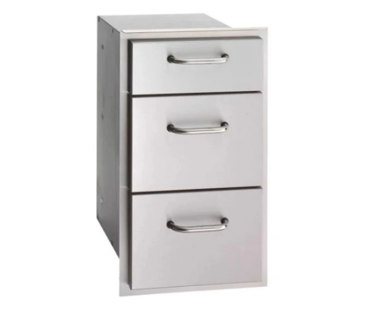 - Fire Magic triple drawers store all the accessories necessary for your outdoor kitchen