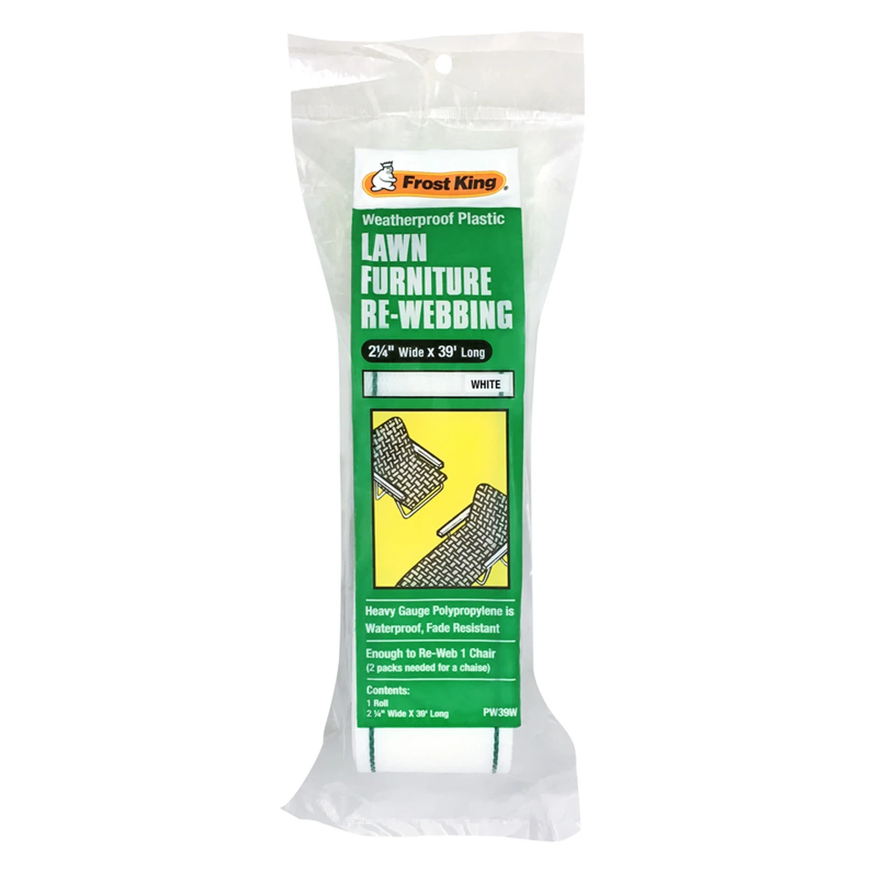 Make your lawn furniture look like new again with Frost King’s Co 39 feet white webbing. This material is designed to easily restore your faded and worn outdoor furniture. The polypropylene webbing comes in a 39 inch roll and is made for lasting use. It is waterproof and resists fading, making it ideal for outdoor use. Prepare your patio chairs and recliners for the summer months with this white webbing.