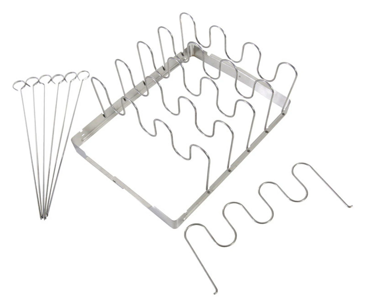 The stainless steel rack frame can hold either 6 skewers or 6 rib rack supports for twice the cooking versatility. The frame folds down for easy storage and easy to clean up.