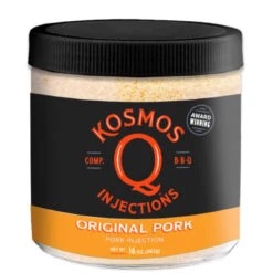 Nothing says heaven on earth quite like tender pork ribs and loins, and nothing makes them tender like a premium injection. Using a special home blend of all-natural salts and spices primed for maximum moisture retention, combined with the smoky sweetness of brown sugar and top-quality pork stock, brace yourself for an pulled pork injection that gives a whole new meaning to the phrase “fall-off-the-bone.” Perfected by a competition pit-master, FOR competition pit-masters, there aren’t many other clear-cut ways to secure your throne as Ruler of the Grill. You know your ribs are headed in the right direction when you choose to use Kosmo’s Q Pork Injection.