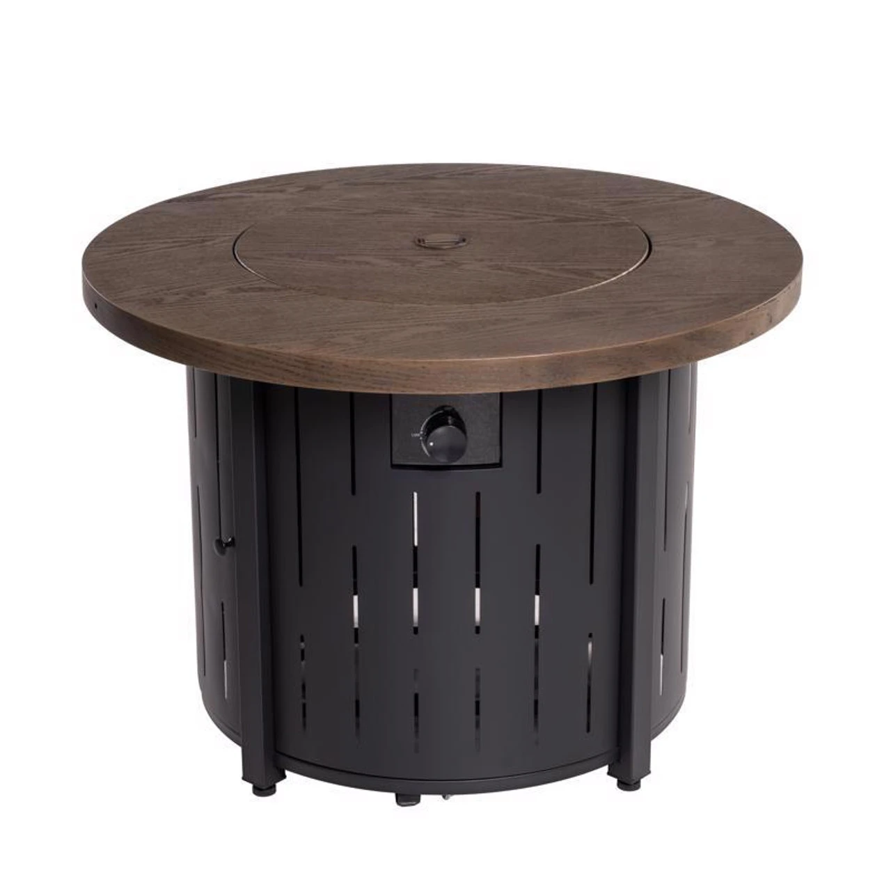 36in round gas fire pit table, 50,000 BTU. Outdoor patio propane firepit with a wood grain look table top, glass beads and a hideaway tank holder.