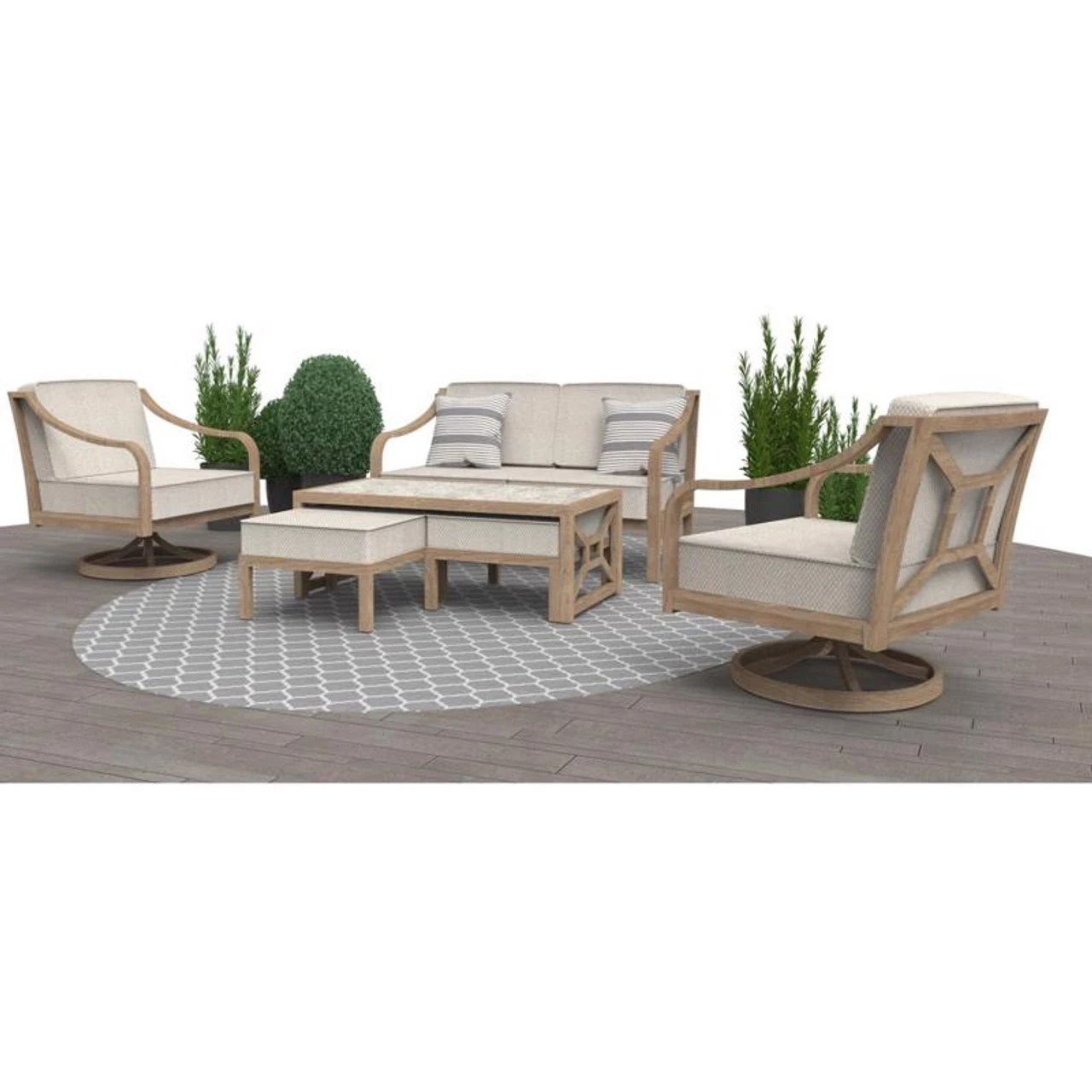 Transform your outdoor space into a stylish and inviting oasis with our exceptional 6 piece patio furniture set. Crafted with durability in mind, ensuring long lasting performance even in harsh weather conditions. The hand-painted woodgrain finish adds a touch of elegance and charm to your outdoor decor. Sink into the plush comfort of polyester fabric cushions, designed to provide optimal relaxation while also being resistant to fading and wear. The swivel rocking club chairs take relaxation to the next level, allowing you to effortlessly sway and enjoy the tranquility of your surroundings. The coffee table features a stamped wood pattern tabletop, adding a rustic and natural element to your outdoor setup. What sets this set apart is the innovative design of the ottomans, which conveniently nest under the coffee table, saving valuable space when not in use. For your peace of mind, this 6 piece patio set comes, reflecting our commitment to quality and customer satisfaction. Whether you’re hosting a gathering or simply enjoying a quiet afternoon outdoors, this set offers comfort, style, and functionality that will enhance any outdoor living space.