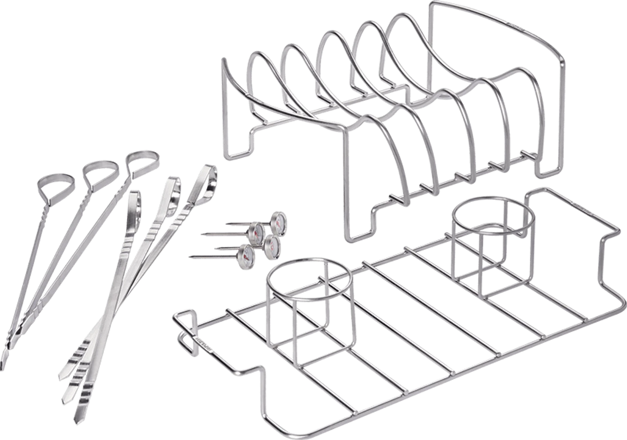 Everything you need to make your own delicious, meaty meals is included in Napoleon’s Meat Lover’s Starter Kit. The Stainless Steel Rib Rack is the perfect way to grill up multiple racks of ribs, or roast some delicious beef. Double your fun with the Stainless Steel Double Beer Can Chicken Roaster. This roaster has two cradles for holding your favorite bubbly beverage in place, while supporting up to two chickens in the perfect position for crispy skin on every side. Build your own kebabs with Six Stainless Steel Skewers. Fill with layers of your favorite marinated meats and veggies for a fun and custom meal that everyone will love. The four, included, Stainless Steel Button Thermometers are perfect for ensuring everyone gets a steak grilled to perfection, that the roast is ready, and the chicken cooked. If you’re a fan of big and beefy barbecues, then our Meat Lover’s Starter Kit is ideal for the perfect backyard party! Clever, multifunctional and easy to maintain, every kitchen benefits from the addition of a Napoleon barbecue accessory. Our accessories provide you with the essentials to create delicious grilled food and then some to enhance your cooking arsenal with a wide variety of creative additions to broaden your culinary horizons.
