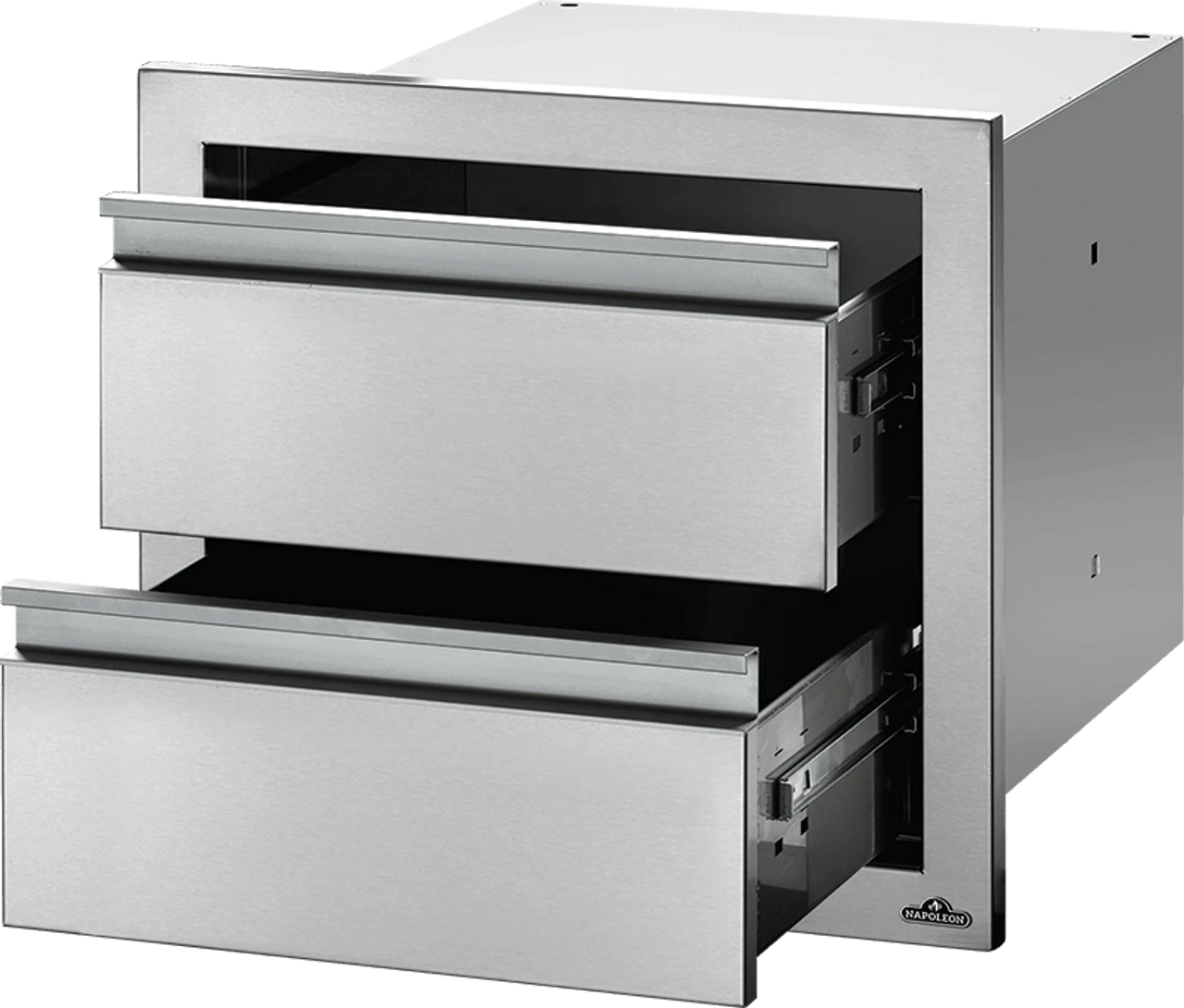 Creating your own custom grill island has never been easier with Napoleon’s Built-In Components. Every great outdoor kitchen needs storage; this spacious double drawer is 18″ x 16″, great for storing tools and spices. It features stainless steel construction, soft closing hardware, seamless trim, and anodized aluminum handles.