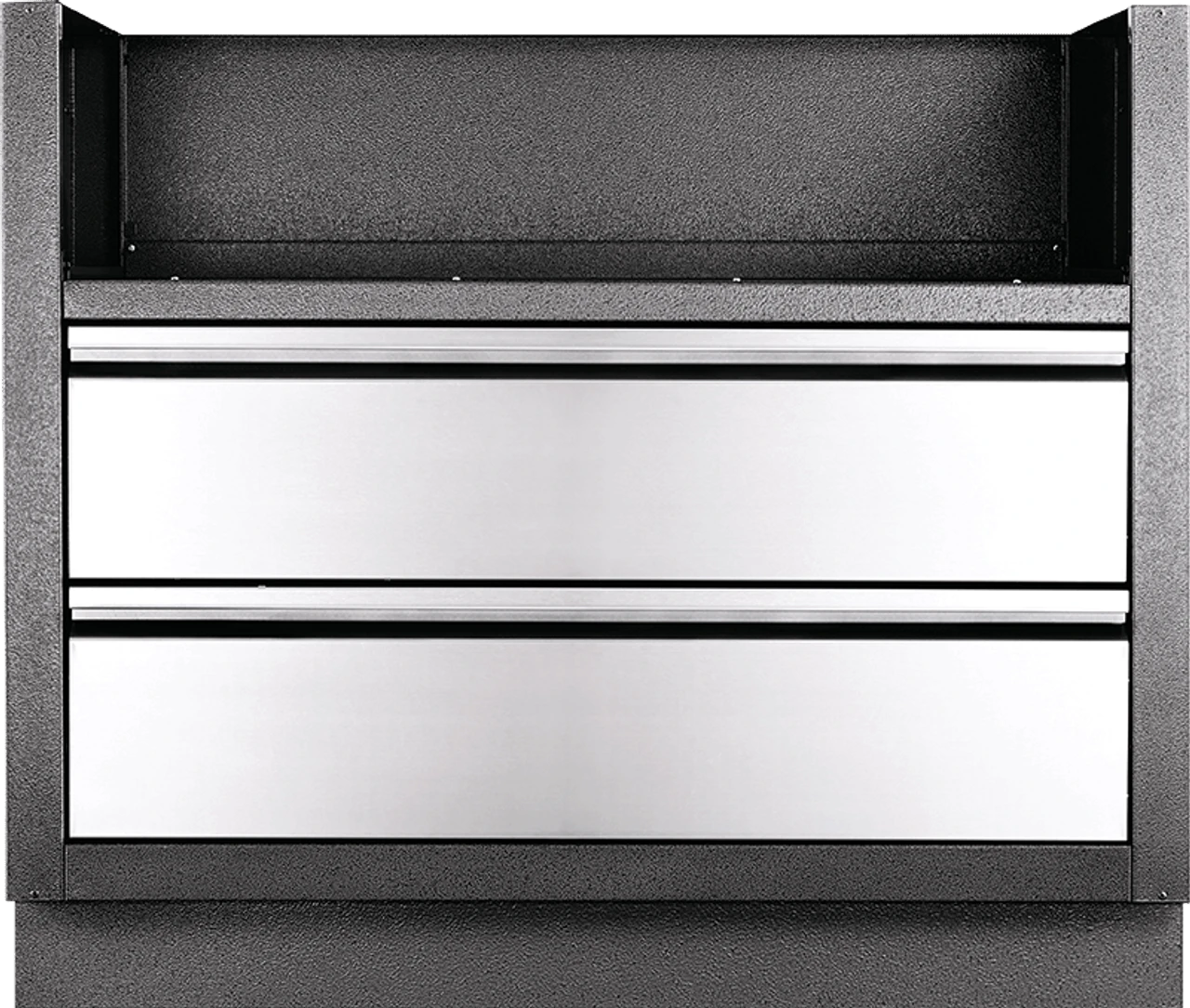 Specially made for the Built-In 700 Series 38″ Gas Grill Heads, this carbon colored, powder coated, galvanneal cabinetry features increased durability from the two-coat pebbling finishing system. Two stainless steel drawers are mounted on smooth gliding tracks for under grill storage. Installation is a breeze with knockouts for gas and electrical. Levelling feet ensure a balanced surface, even if your patio isn’t perfectly level. Partner this cabinet with the Built-In 700 Series 38″ Gas Grill Head and the perfect OASIS™ cabinets for a custom outdoor grilling OASIS™.