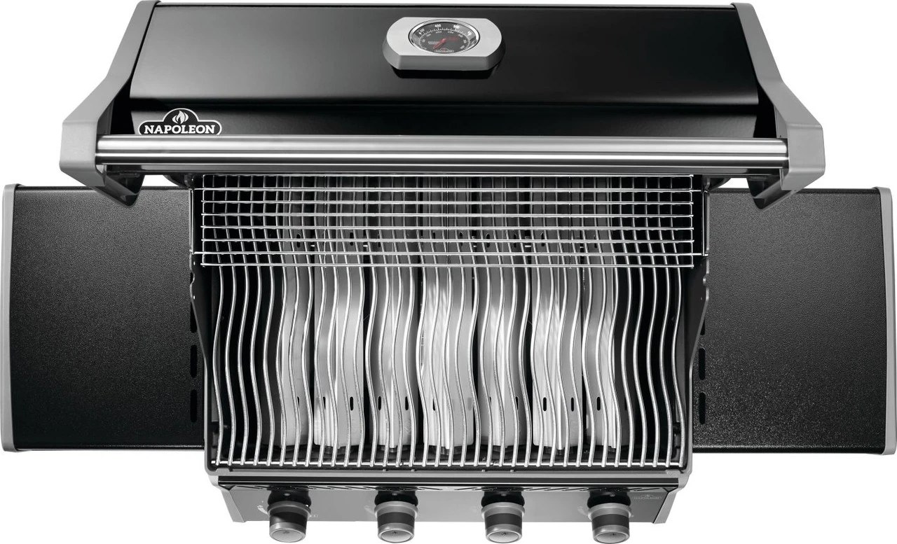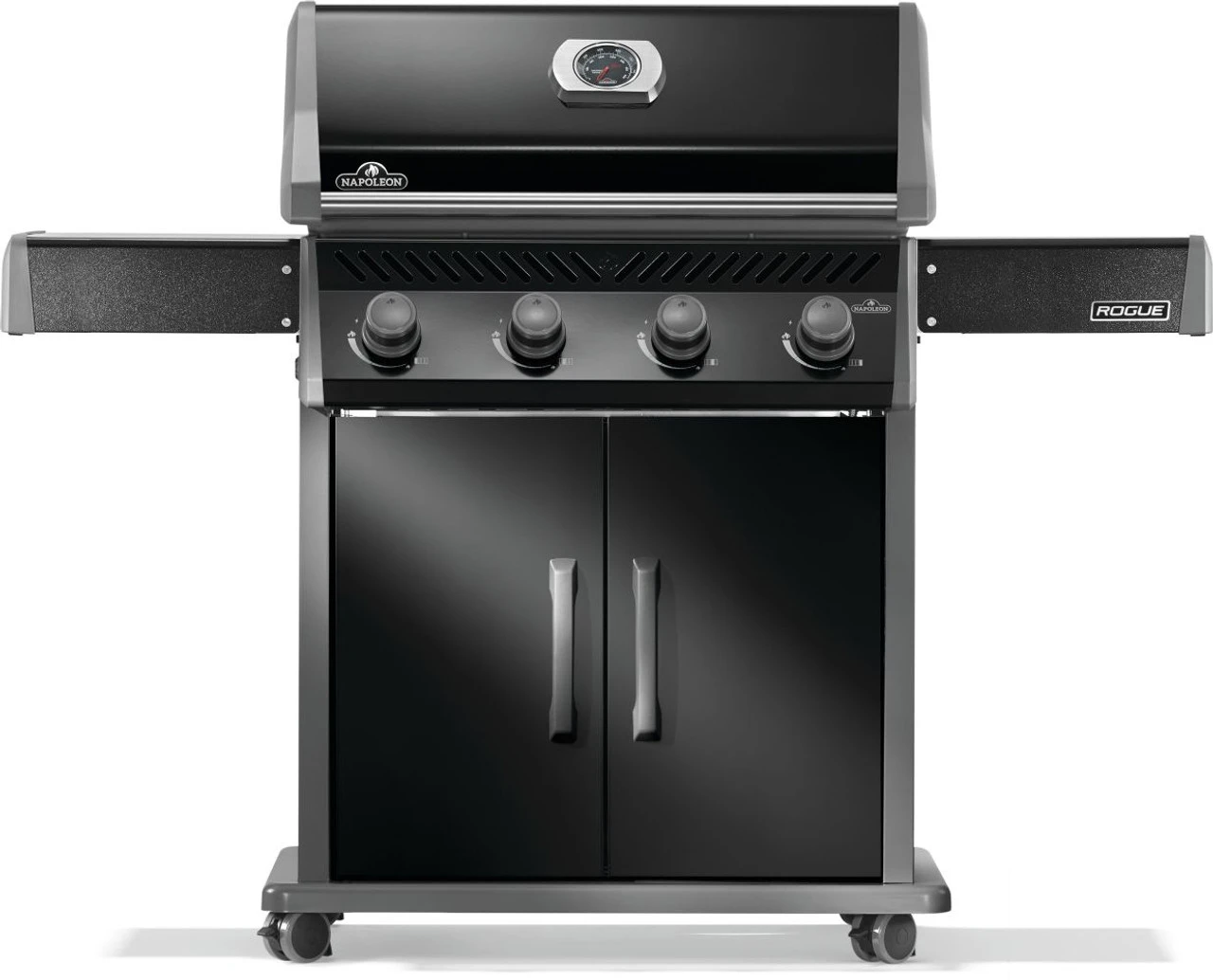 The sleek Napoleon Rogue® 525 Propane Gas Grill in black is a stylish upgrade for your outdoor living space. Achieve the best sear marks with our Wave shaped stainless steel cooking grids. Four stainless steel burners ensure precise temperature control, while dual-level sear plates intensify flavors by vaporizing drippings. With 525 square inches of grilling space, create mouthwatering meals for any occasion. The easy-to-maintain porcelainized lid and powder-coated body seamlessly blend with your outdoor decor. Maneuver with ease using locking casters, and save space with folding stainless steel side shelves. Experience unmatched versatility, quality, and affordability with this Napoleon Rogue® Gas Grill.