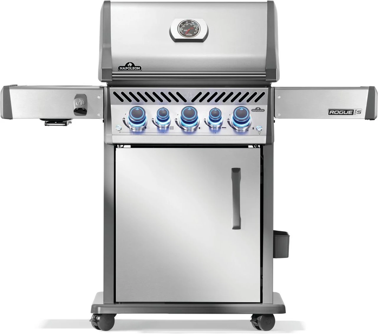 When premium features combine with excellence; you get the Rogue® PRO-S 425 Stainless Steel Grill in Propane Gas. Experience succulent roast meals with the rear infrared rotisserie burner, while the large infrared sear station, side burner delivers restaurant-quality sauces, sides, or sears meat perfectly. The iconic WAVE™ shaped cooking grids ensure even heating and prevent food from falling through while dual-level stainless steel sear plates keep your grill pristine by vaporizing drippings. The ergonomic control knobs feature SaftyGlow™, illuminating red when a burner is in use, making operation safe and effortless. A convenient, space-saving folding side shelf and easy-locking casters ensure convenience. The durable and stunning stainless steel construction is easy to maintain and withstands all environments. Elevate your outdoor grilling with superior quality and style. Welcome the ultimate grilling experience with the Rogue® PRO-S grill.