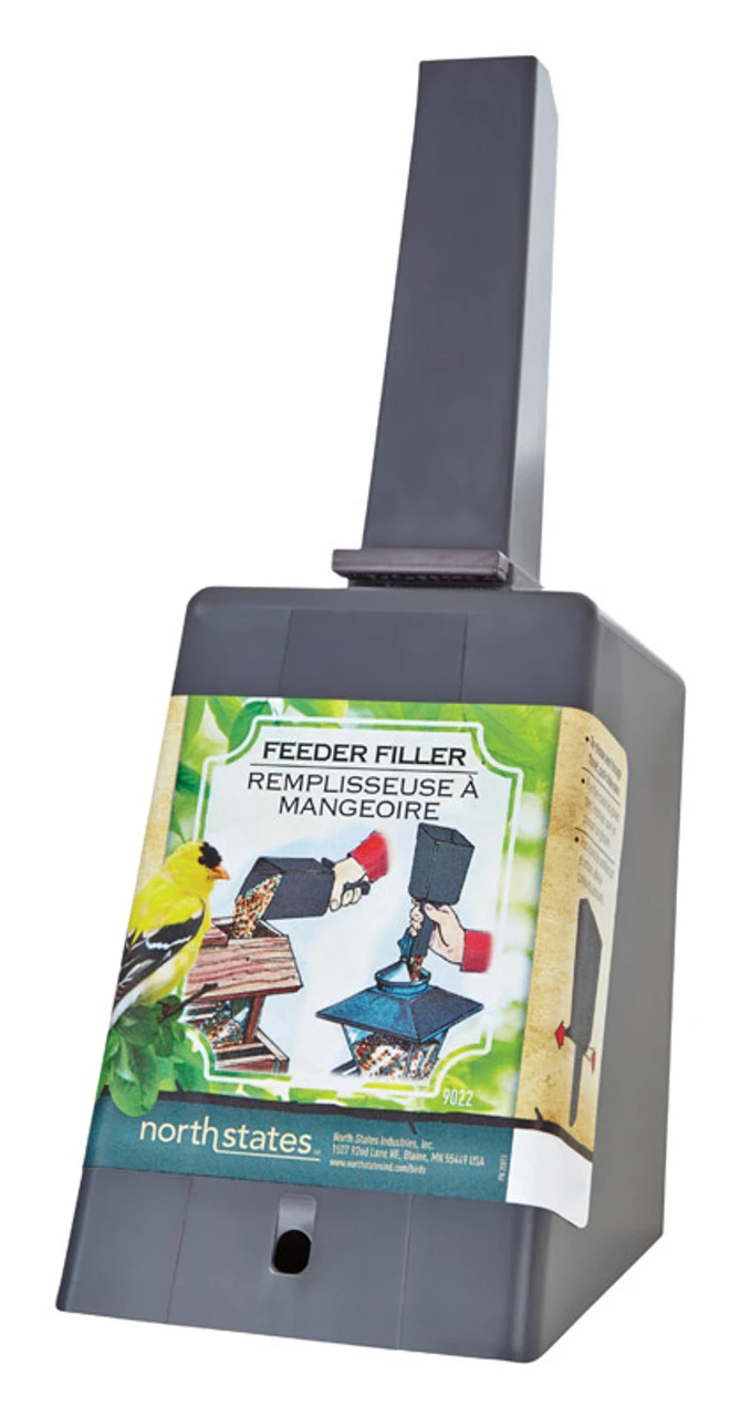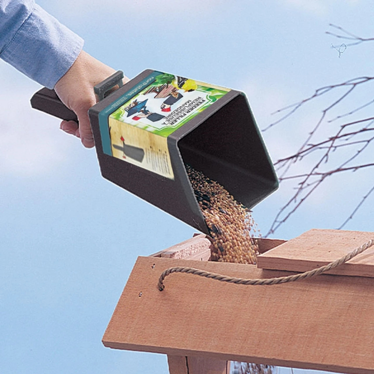 The feeder filler scoop is perfect for filling a variety of feeders – it works as a scoop and/or a funnel. Use the hand-held scoop for filling large feeders and the funnel for smaller feeders. Able to hold approximately 4 cups of seed, the feeder filler scoop virtually eliminates the mess associated with feeder refills. As an added bonus, it has a handy clip hanger to keep the scoop up and out of the way.