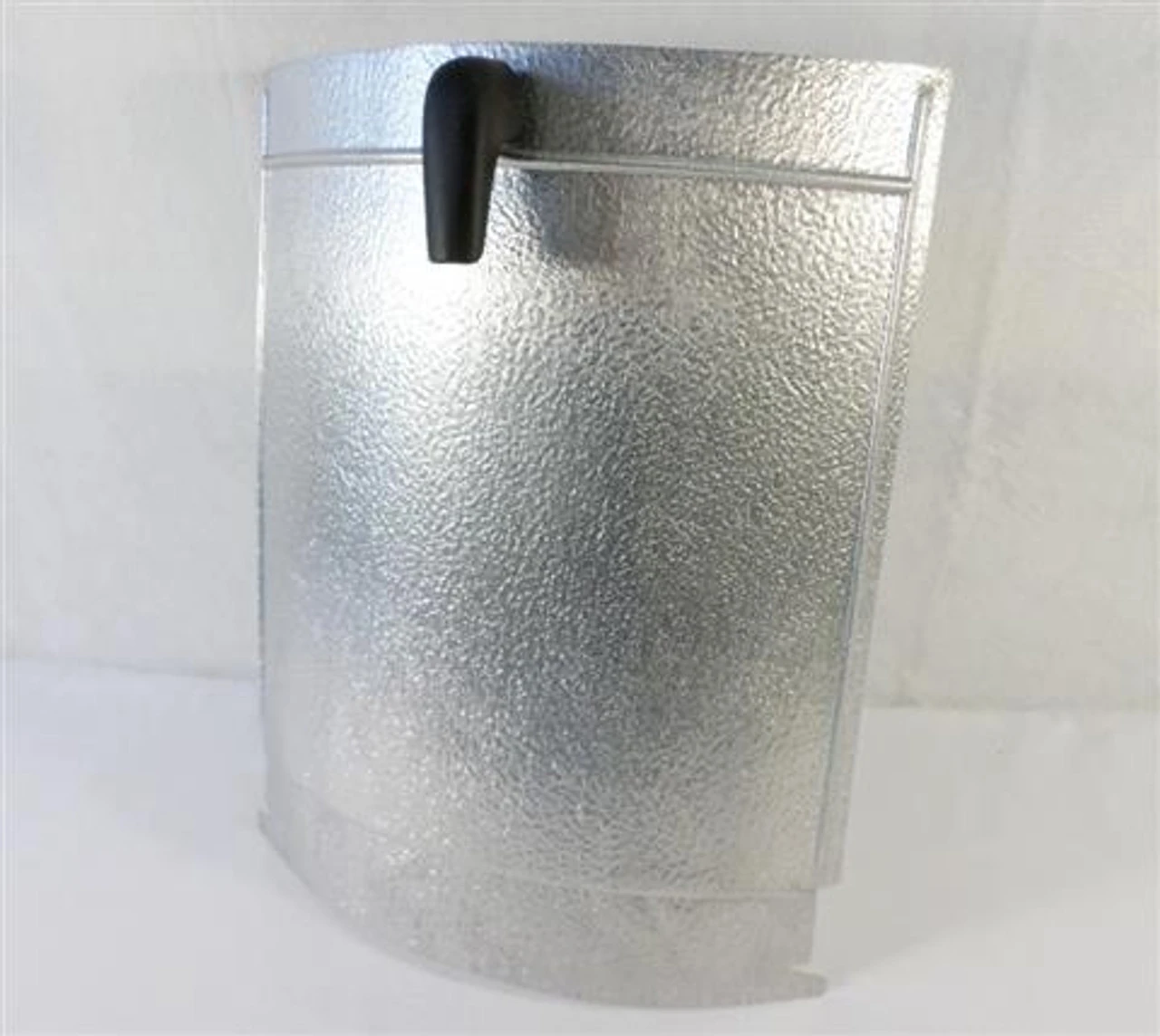 Aluminum door assembly with a handle measuring 7-3/4″ x 11-3/4″, designed for the Weber 18″ Smokey Mountain Cooker. It includes two 90-degree mounting tabs on the bottom edge and a handle with a locking pivot tab on the top.
