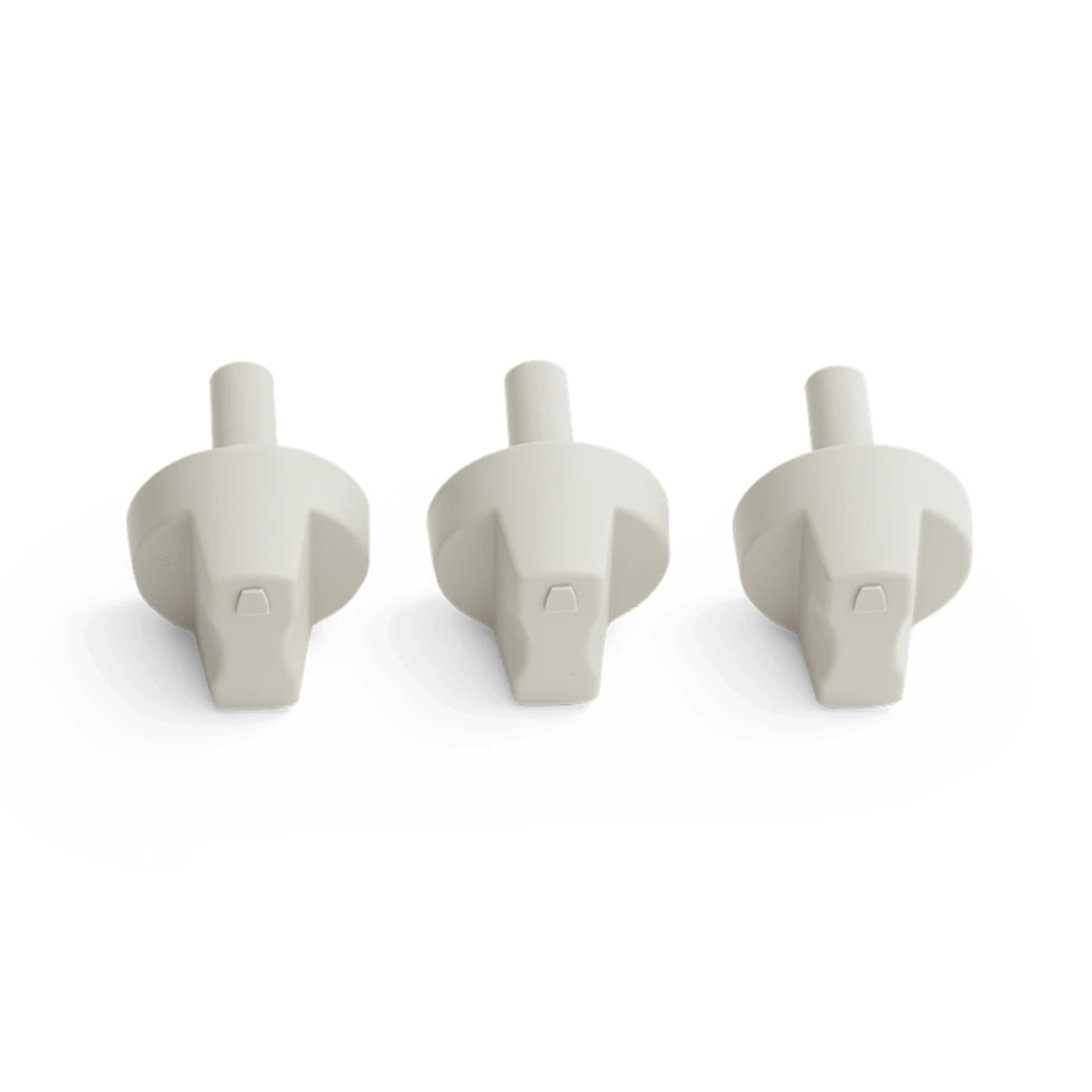 A set of three gas control knobs featuring a modern design compatible with both newer and older models. Sporting a sleek light grey color, each knob measures 2-1/4″ in diameter, with a stem length extending 1-3/8″ from the bottom for easy handling and adjustment.