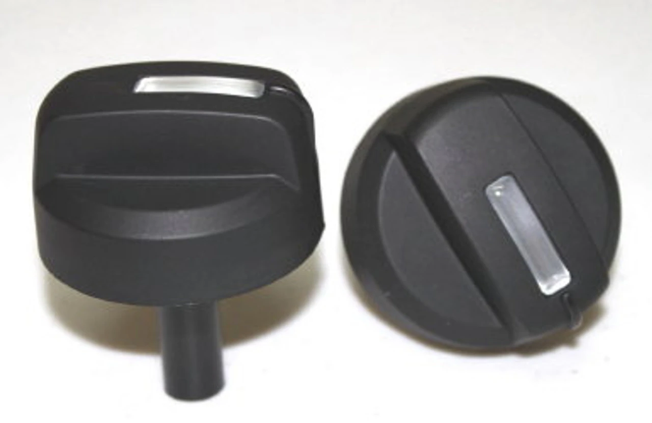 Set of two Weber Spirit control knobs. Black with inset translucent position indicators. 2-1/8″ in diameter and 1-1/2″ stem. (These are from 2009 models and also will fit older Spirit models)