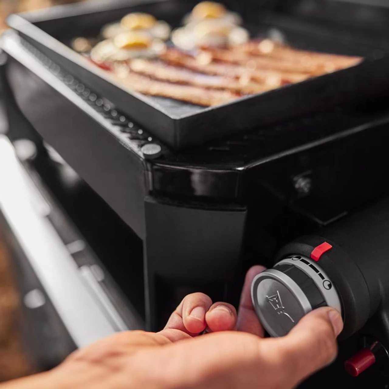 Explore griddling anywhere, including small patios, tailgates, and beyond, with the 17″ Rust-Resistant Weber Slate Tabletop portable griddle. It’s ready to cook on right out of the box. Weber Slate cooktops are made differently than other griddles; the carbon-steel gets transformed under extreme heat and pressure that case hardens and bonds the surface, reducing the ability for moisture to collect and rust to form. It is then pre-seasoned with food-safe oils that condition the metal for an extra boost of rust resistance and a natural, easy-release cooking surface right out of the box. No use of coatings means you can use metal tools to flip, press, and scrape without worry. It reaches over 500 degrees and heats evenly for consistently cooked food across the cooktop. Adjustable feet let you level the travel griddle on uneven surfaces, and an expandable stand (sold separately) makes the Slate Tabletop Griddle an excellent tailgating grill, camping griddle, and more.
